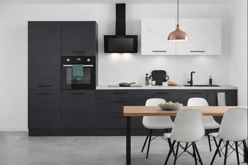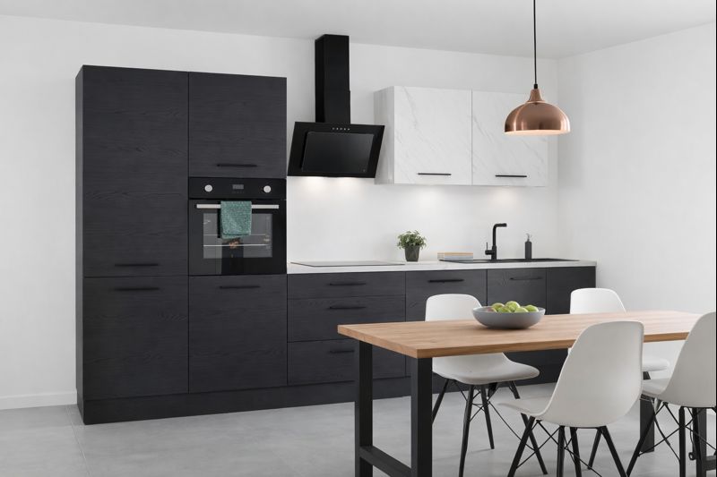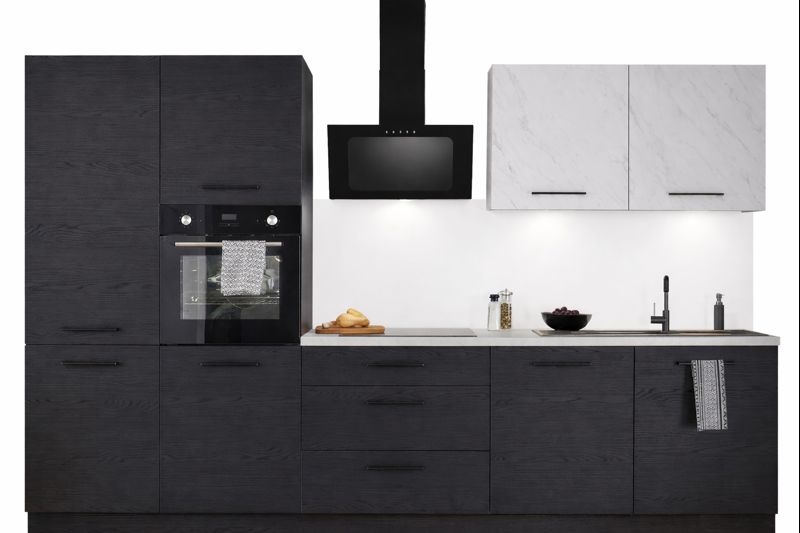 Moderní kuchyňská linka o celkové šířce 320 cm v elegantní grafitové barvě s mramorovým dekorem. Sestava zahrnuje závěsnou skříňku, spodní skříňku se třemi zásuvkami, dřezovou skříňku a vysokou skříň pro vestavnou lednici. Pracovní deska v dekoru světlého mramoru má vodoodpudivou úpravu a tloušťku 38 mm. Kuchyň je připravena pro vestavnou troubu, myčku i lednici, elektrospotřebiče však nejsou součástí dodávky. Vyrobeno v EU.