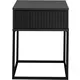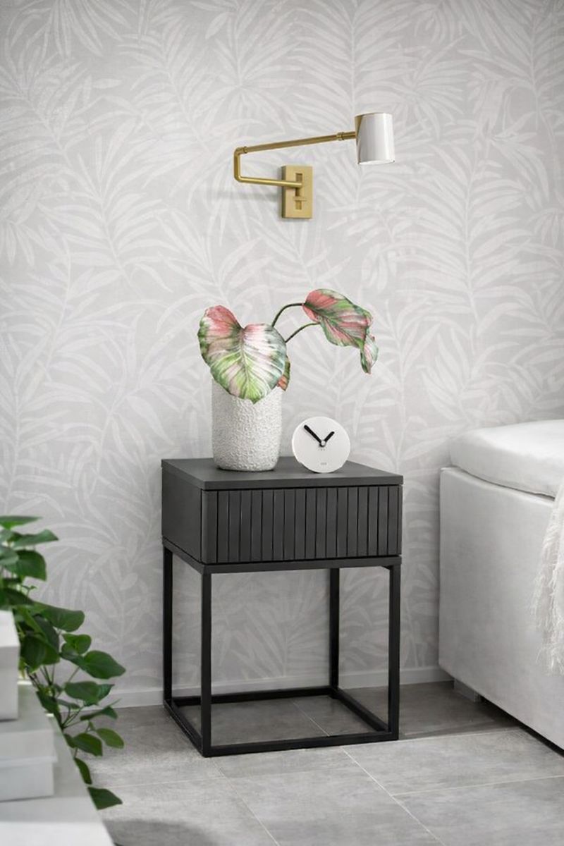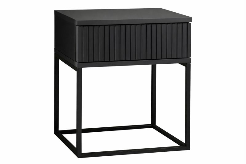 Moderní noční stolek v bílé barvě s kontrastními černými kovovými nohami zaujme čistým, minimalistickým designem. Bezúchytkové otevírání a jedna zásuvka poskytují praktický úložný prostor. Stolek je vyroben z kompozitního dřeva s melaminovým povrchem a stabilní ocelovou konstrukcí, vhodný do ložnice i jako drobný doplňkový nábytek.
