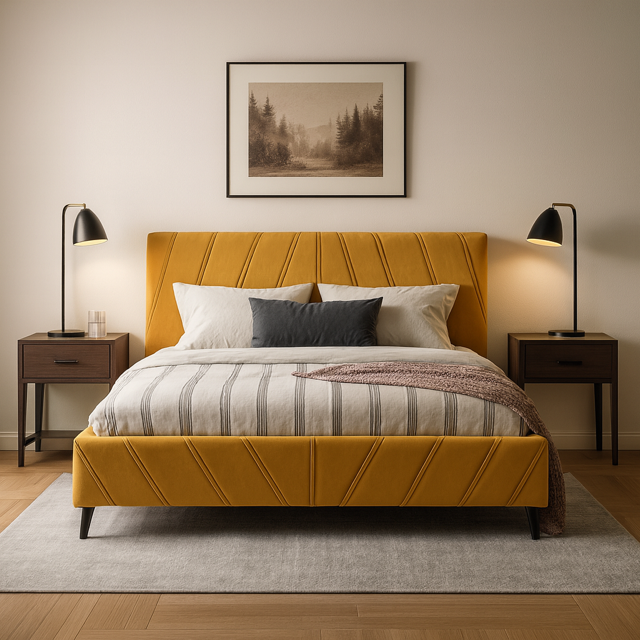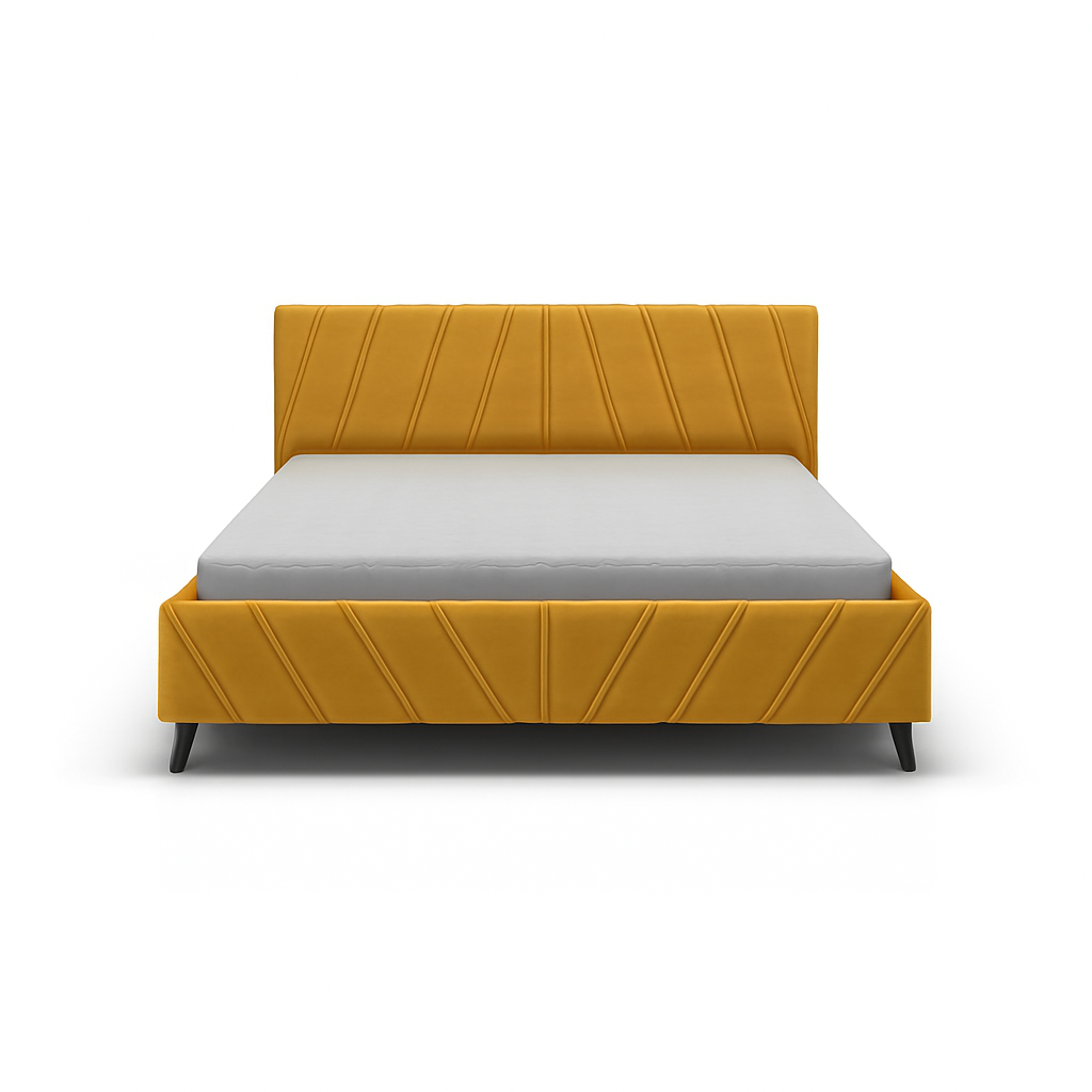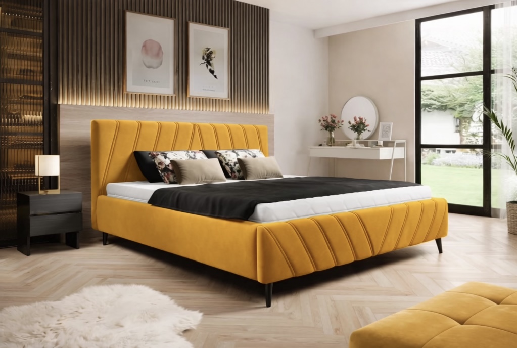 Okouzlující čalouněná postel MELLI zaujme hned na první pohled svým výrazným designem. Okrově žlutý velurový potah v kombinaci s ozdobným prošíváním na vysokém záhlaví i nožní části dodává posteli elegantní a moderní vzhled. Celkový dojem podtrhují černé kónické nožičky o výšce přibližně 15 cm, které zároveň usnadňují úklid pod postelí.