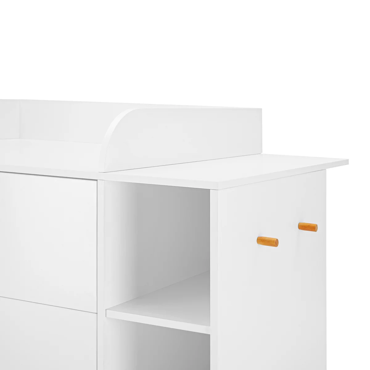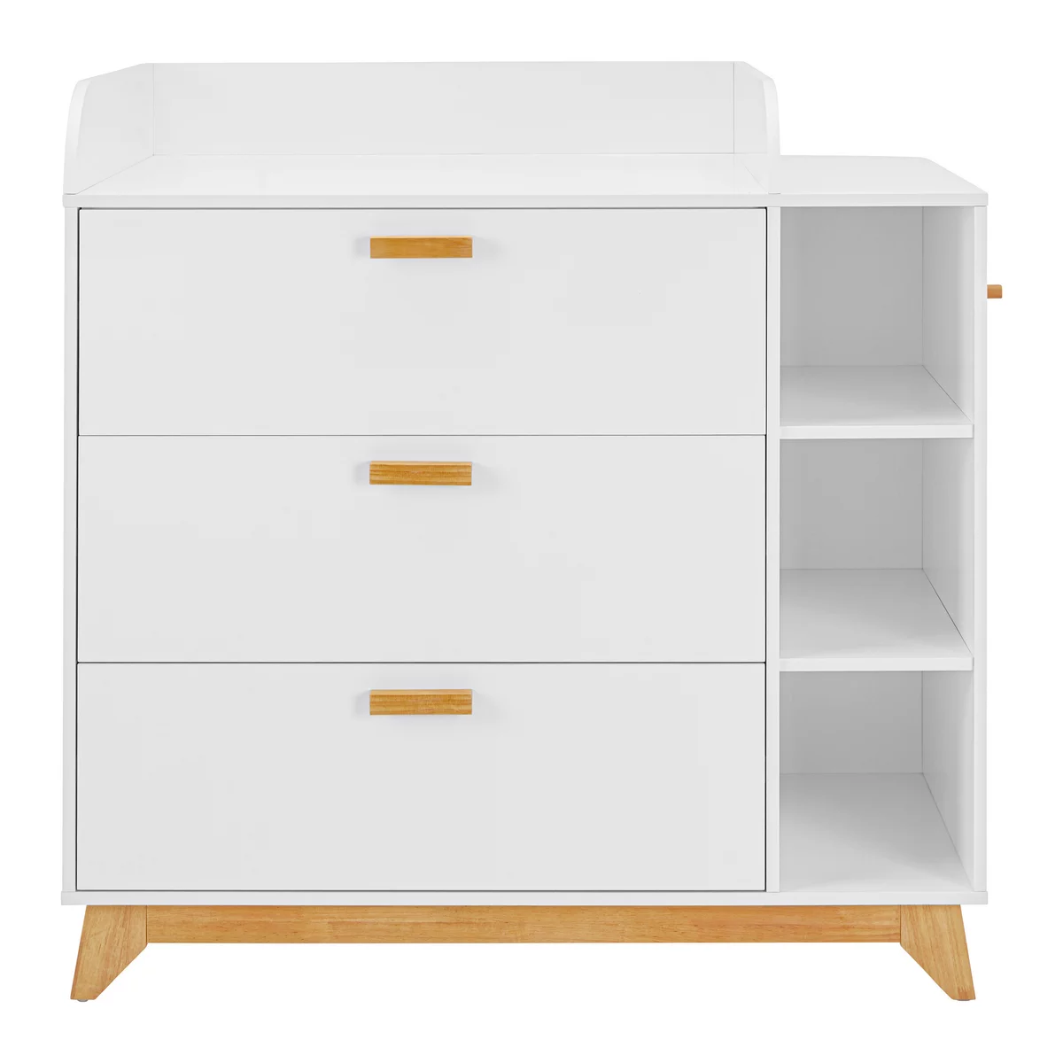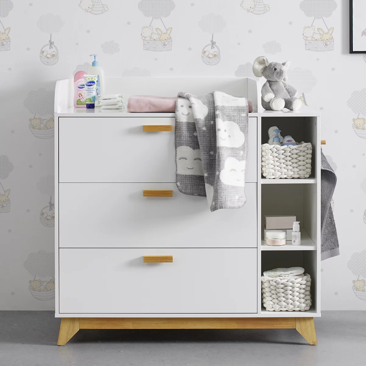 Tento přebalovací pult v kombinaci bílé a světle hnědé barvy představuje praktický i estetický prvek do dětského pokoje nebo přebalovacího koutku v ložnici. Je vyroben z MDF desek s odolným melaminovým povrchem a doplněn dřevěnými nohami a úchytkami, které harmonicky kontrastují s bílým korpusem nábytku.