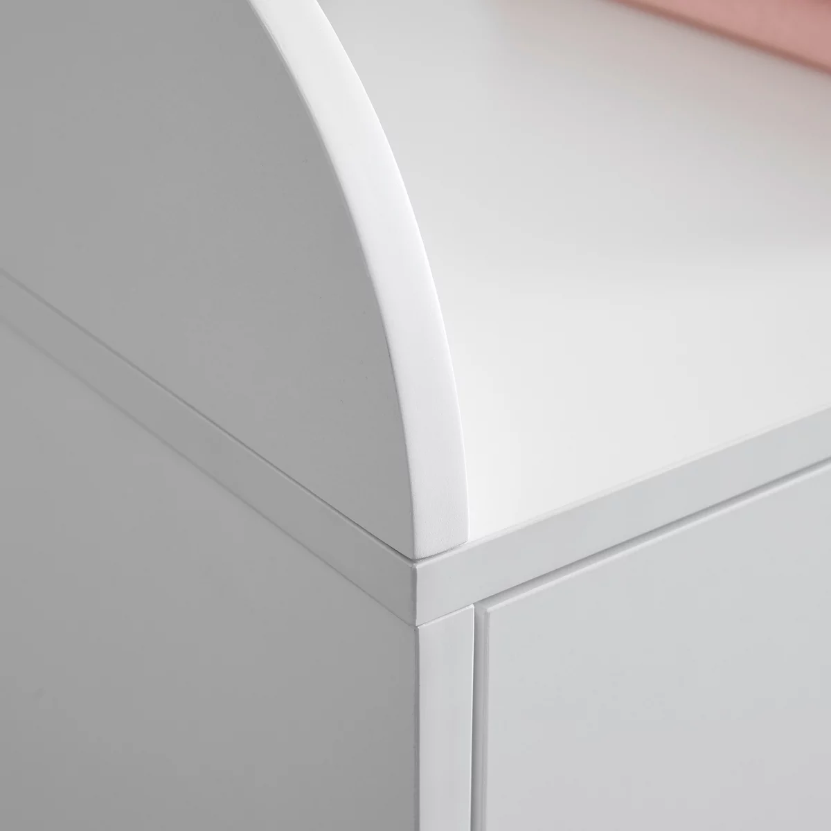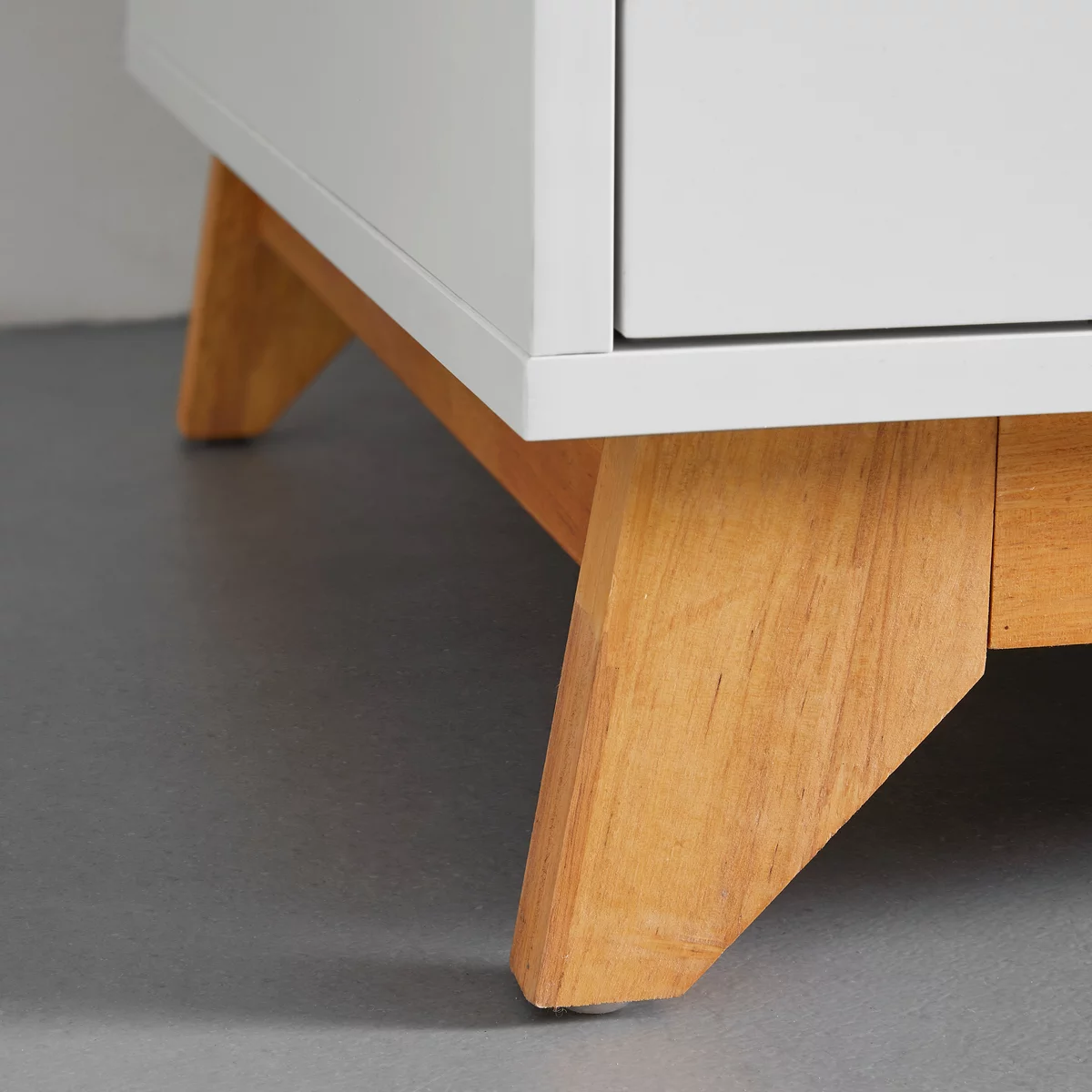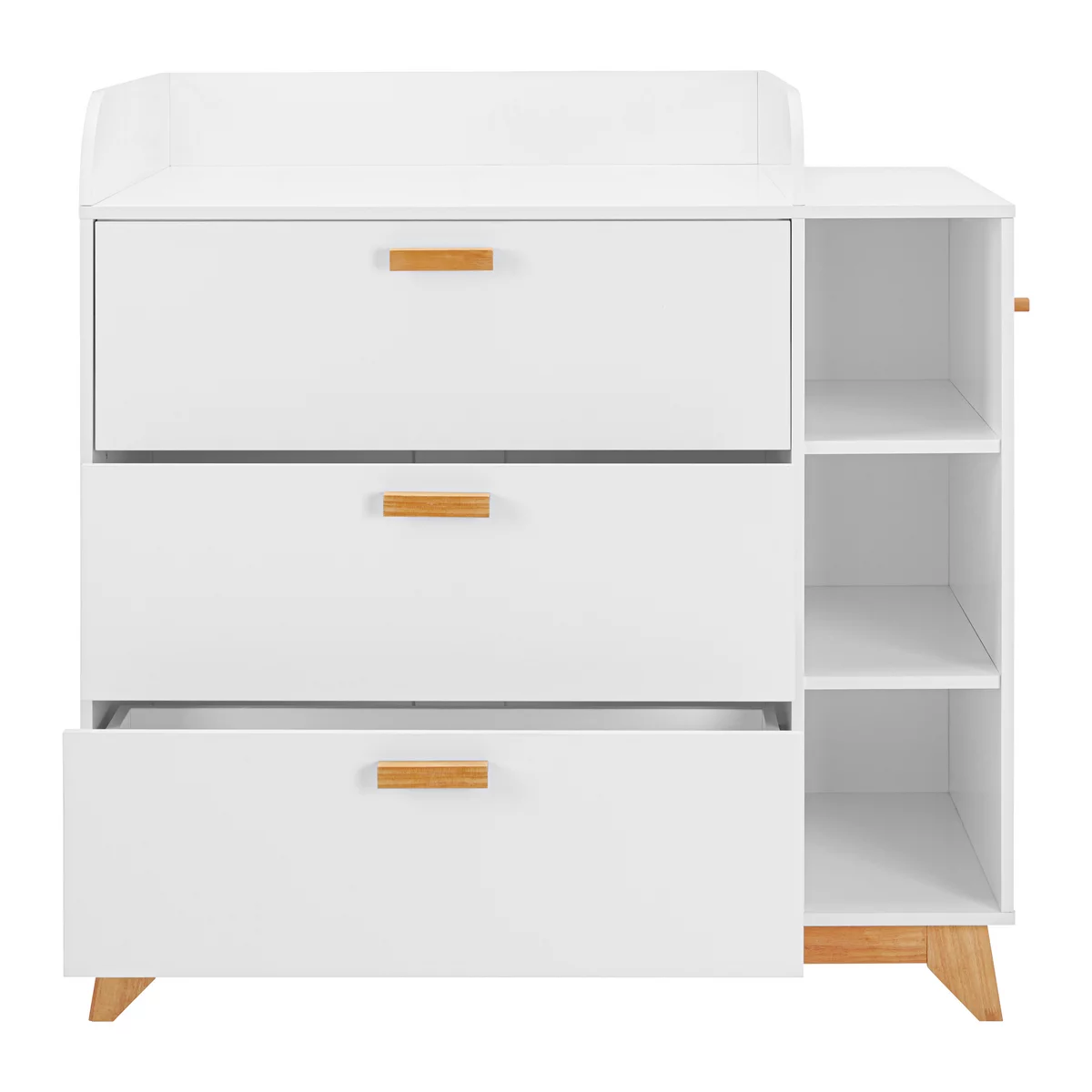 Tento přebalovací pult v kombinaci bílé a světle hnědé barvy představuje praktický i estetický prvek do dětského pokoje nebo přebalovacího koutku v ložnici. Je vyroben z MDF desek s odolným melaminovým povrchem a doplněn dřevěnými nohami a úchytkami, které harmonicky kontrastují s bílým korpusem nábytku.