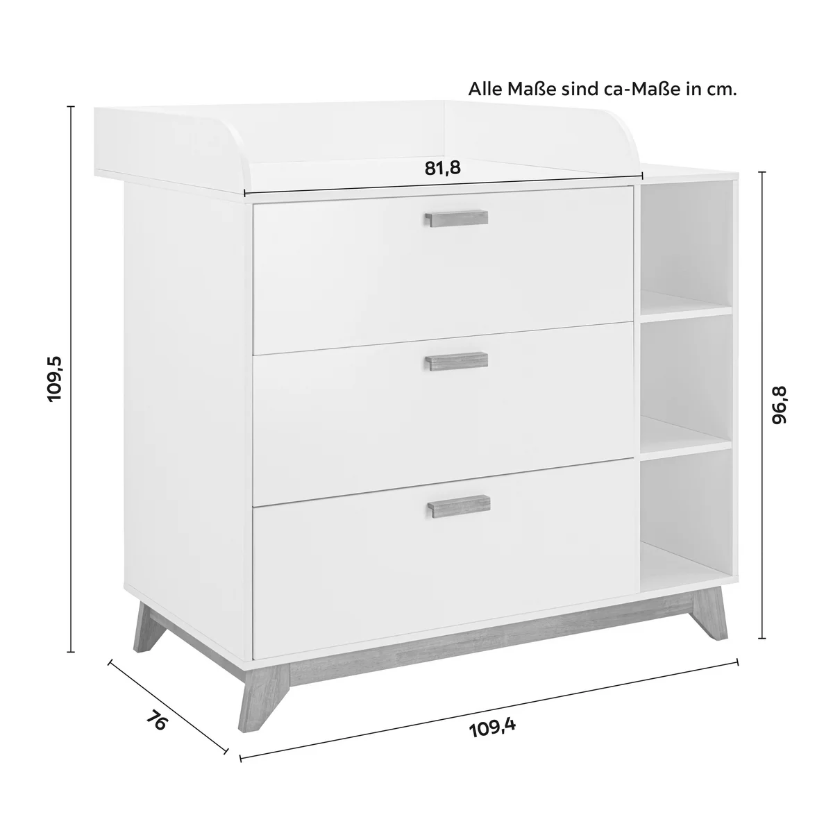 Pult nabízí pohodlnou přebalovací plochu o rozměrech  81,8 × 13 × 74,5 cm (š × v × h). Pod ní se nachází dvě pevné police, které vytvářejí tři otevřené přihrádky pro věci potřebné při každodenní péči o miminko. Další úložný prostor zajišťují tři prostorné zásuvky s vnitřními rozměry cca 77 × 36,5 cm (š × h), ideální pro uložení oblečení, kosmetiky či dalších doplňků.