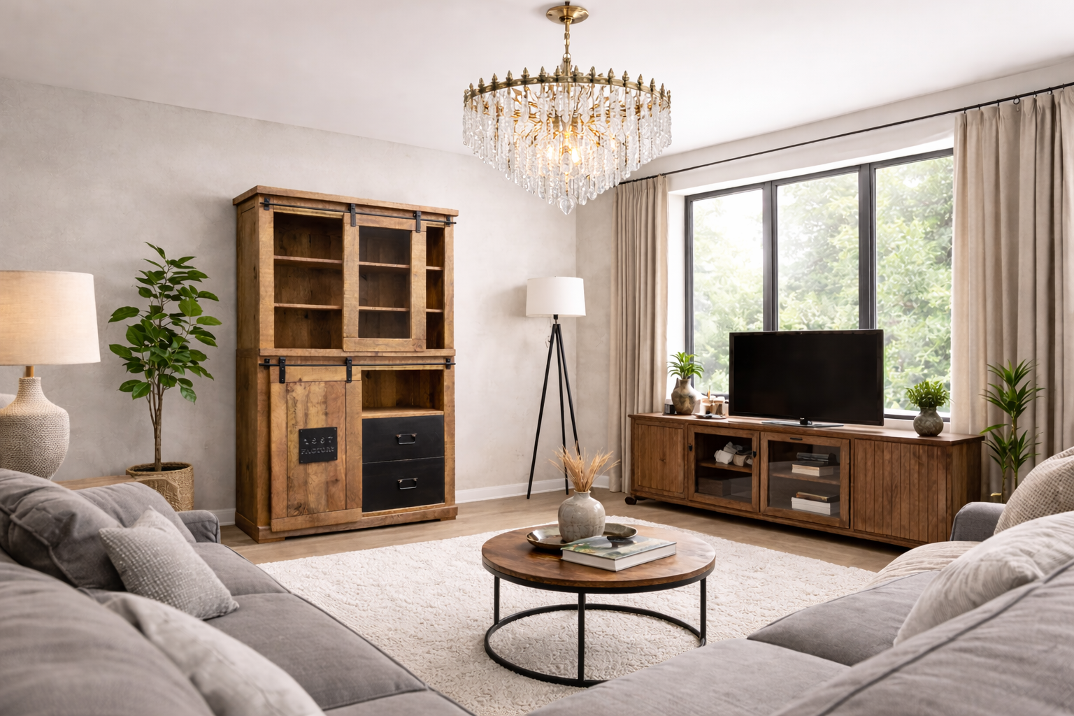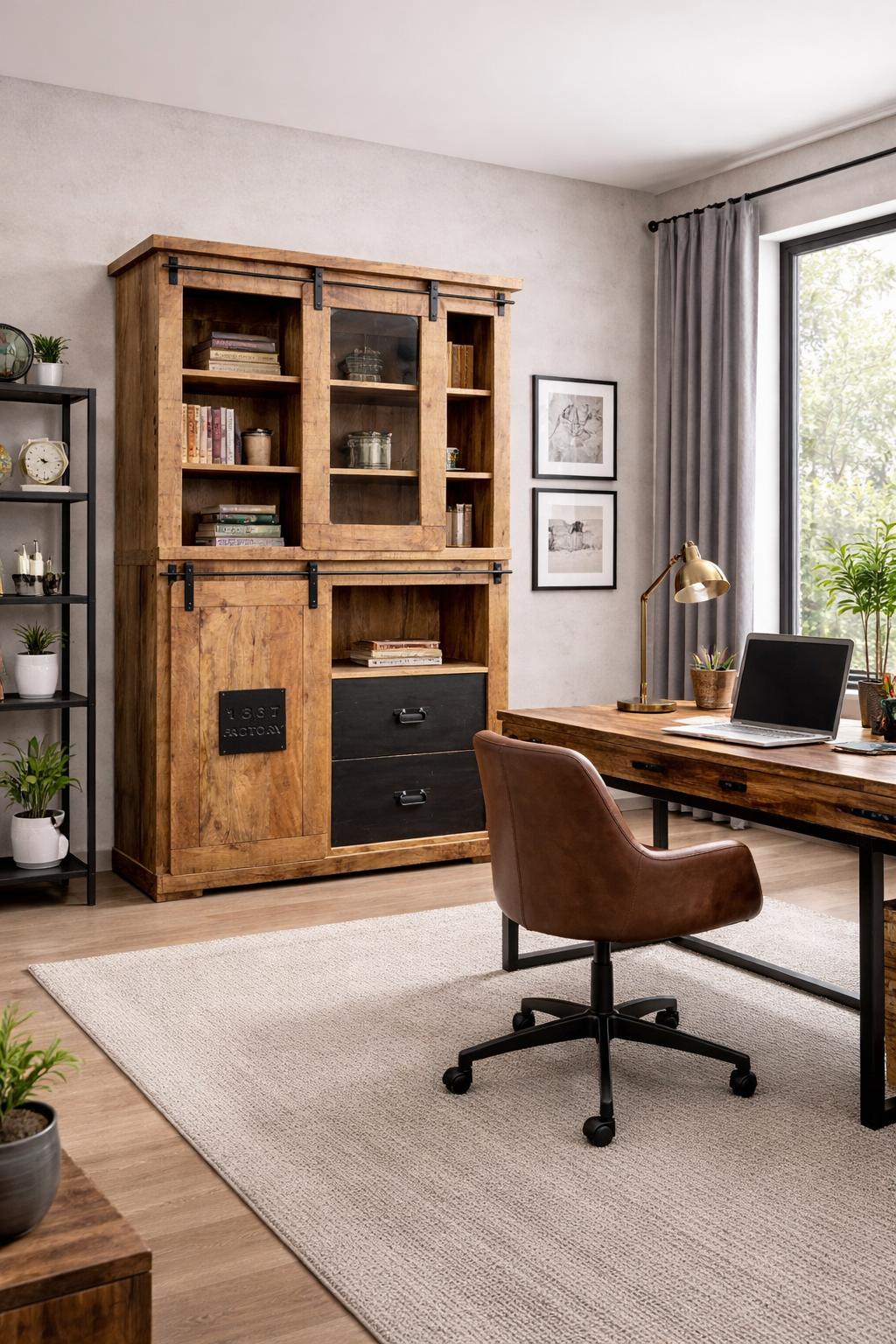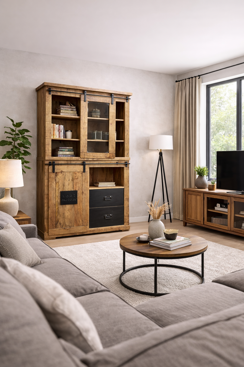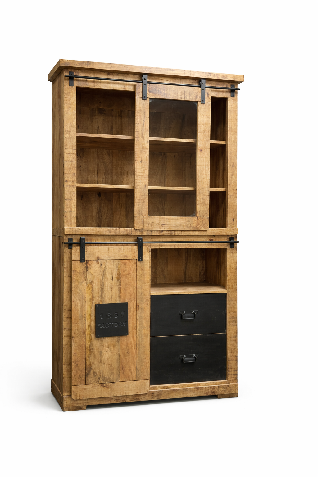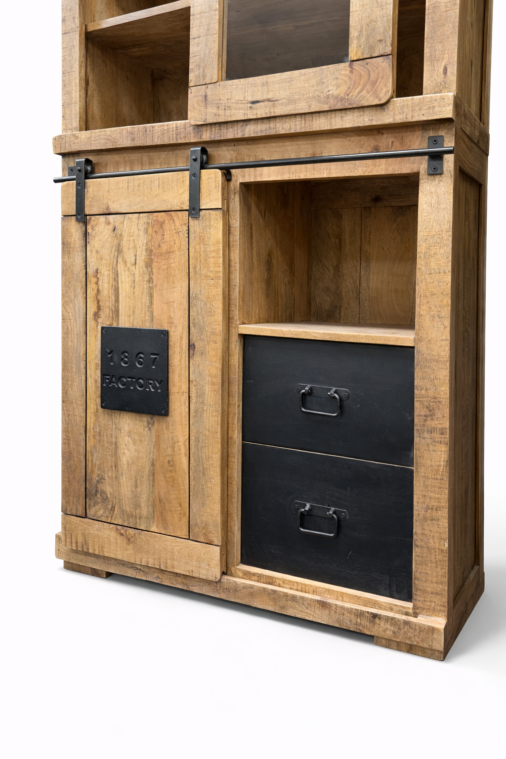 Design vitríny kombinuje rustikální přírodní prvky s moderním industriálním stylem. Kovové detaily, jako jsou robustní úchyty a kovová deska na dvířkách, dodávají vitríně jedinečný charakter a zvýrazňují její manufakturní vzhled.