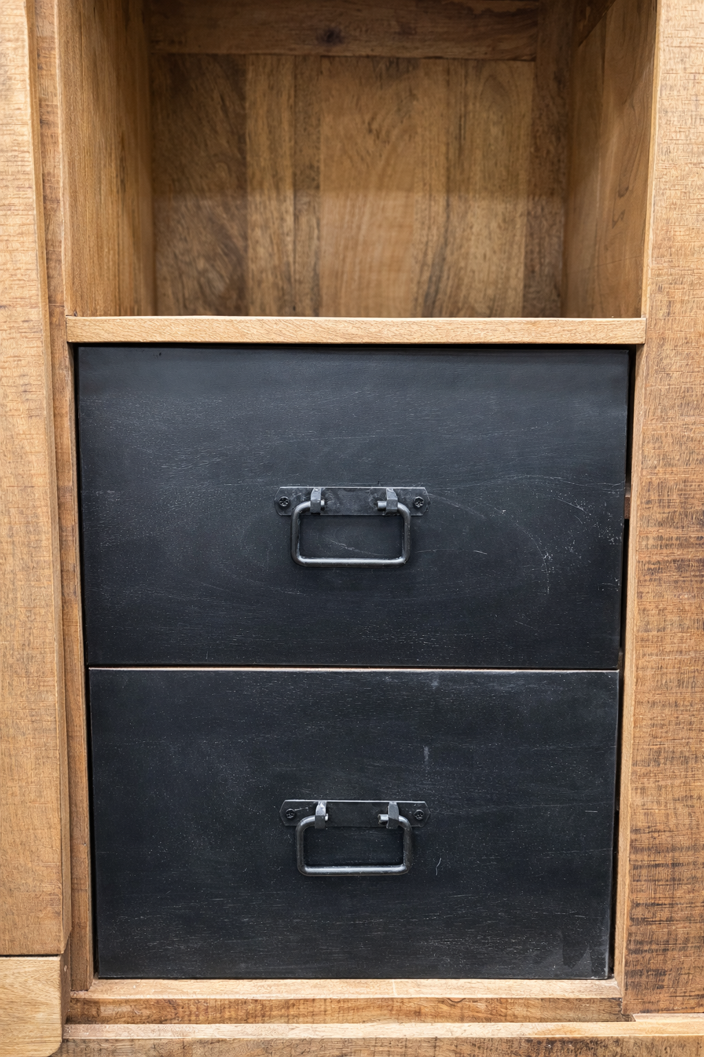 Horní část vitríny tvoří prosklená dvířka, která umožňují vystavit dekorace, knihy nebo sklo a zároveň je chrání před prachem. Spodní část nabízí praktický úložný prostor – dvířka zdobená kovovou deskou a dvě zásuvky s kovovými úchyty poskytují bezpečné a snadno přístupné místo pro uložení různých předmětů.
