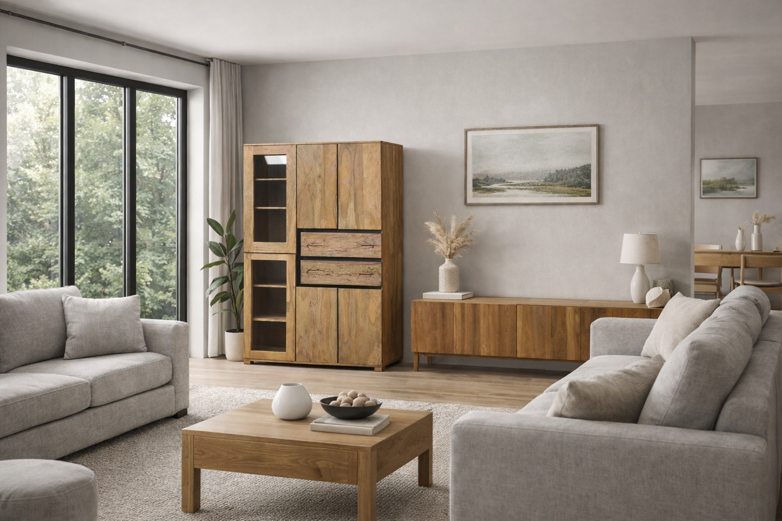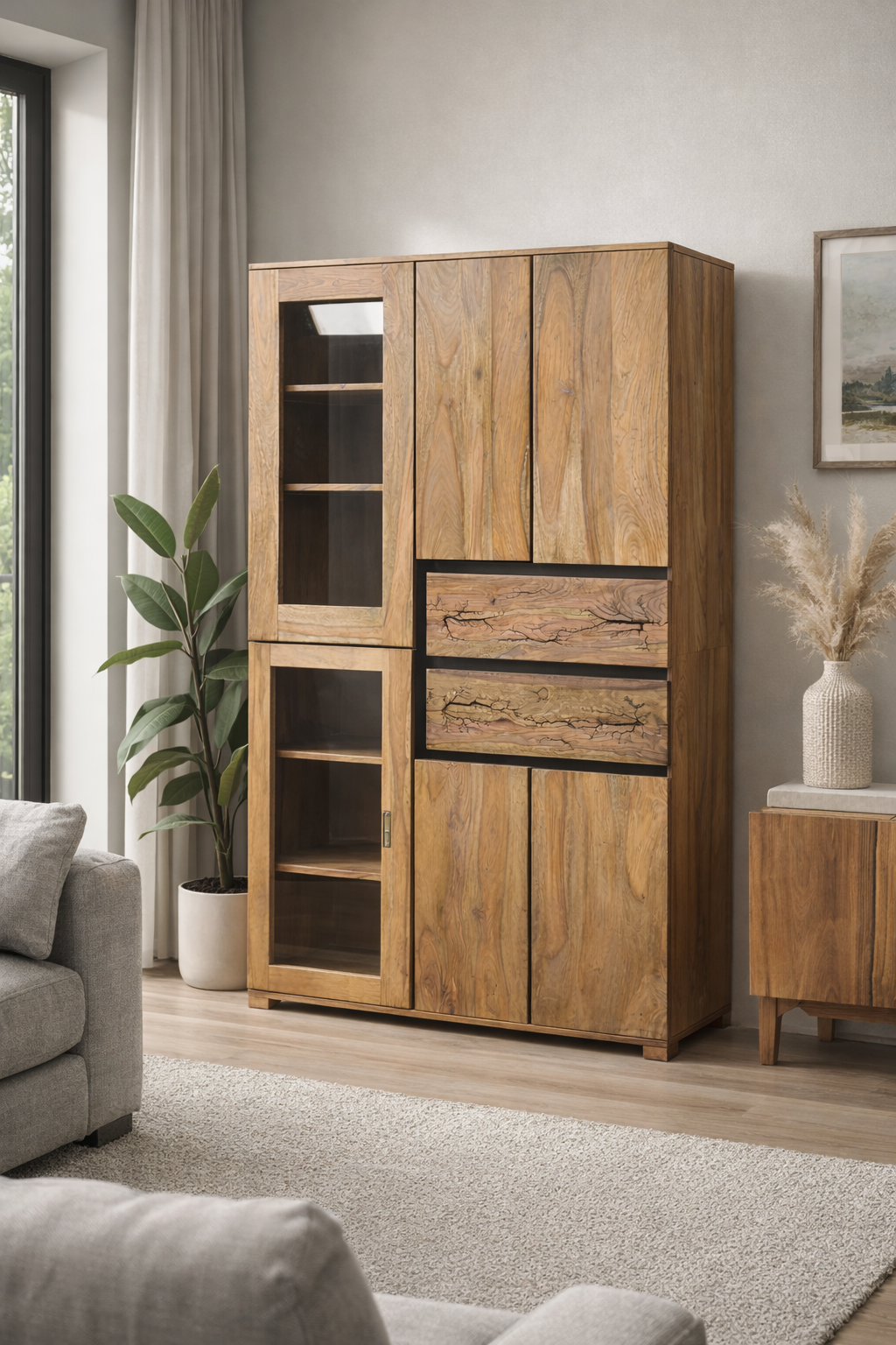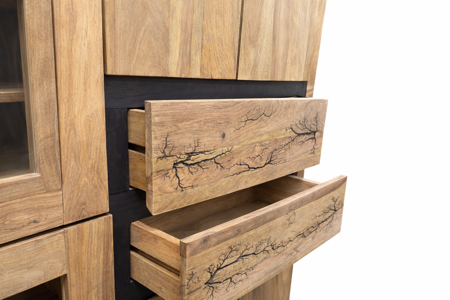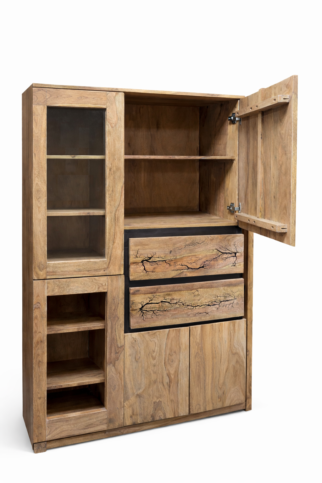 Vitrína THUNDER je originální solitér z masivního dřeva s autentickou kresbou a dekorativním „prasklým“ efektem. Kombinuje uzavřené skříňky, zásuvky a prosklené police, ideální pro úložení i vystavení dekorací, knih nebo nádobí. Robustní konstrukce zaručuje stabilitu a dlouhou životnost, zatímco industriální a rustikální design dodá interiéru luxusní a nadčasový charakter.