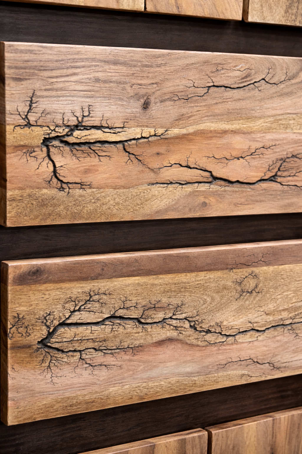 Vitrína THUNDER je výrazný solitér, který okamžitě upoutá pozornost a dodá interiéru osobitý charakter. Tento kus nábytku spojuje přírodní krásu masivního dřeva s moderním industriálním designem a vytváří tak originální prvek, který se stane dominantou každého obývacího pokoje, jídelny, pracovny nebo stylové kanceláře. Masivní dřevo s výraznou kresbou a přirozenými strukturami podtrhuje jedinečnost každého kusu. Charakteristickým prvkem jsou originální čelní plochy zásuvek s dekorativním „prasklým“ efektem, který působí velmi autenticky a dodává vitríně luxusní, ručně zpracovaný vzhled. Každá vitrína je tak svým způsobem originál. Vitrína nabízí prakticky řešený úložný prostor – kombinaci uzavřených skříněk, zásuvek a otevřených i prosklených polic. Díky tomu je ideální pro uložení nádobí, skla, dekorací, knih, dokumentů nebo designových doplňků. Prosklená část umožní vystavit oblíbené předměty, zatímco uzavřené skříňky zajistí dostatek místa pro vše, co chcete mít uložené přehledně a zároveň skryté. Robustní konstrukce z masivního dřeva zaručuje vysokou stabilitu, dlouhou životnost a odolnost při každodenním používání. Vitrína THUNDER je nejen praktickým úložným prostorem, ale také výrazným designovým prvkem, který dodá interiéru pocit kvality, přírodního luxusu a nadčasovosti. Tento nábytek skvěle zapadne do industriálních, rustikálních, moderních i loftových interiérů a perfektně se kombinuje s dalšími kusy z masivu, kovu či přírodních materiálů. Rozměry: Šířka: 100 cm Výška: 75 cm Hloubka: 45 cm