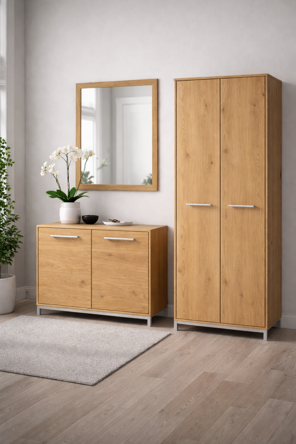 Lavice je řešena jako dvoudveřová skříňka s praktickým úložným prostorem. Za dvířky se nachází nastavitelná dřevěná police, která umožňuje přehledné uložení obuvi, doplňků nebo tašek. Pevná horní deska slouží zároveň jako pohodlné místo k sezení a lze ji volitelně doplnit podsedákem.