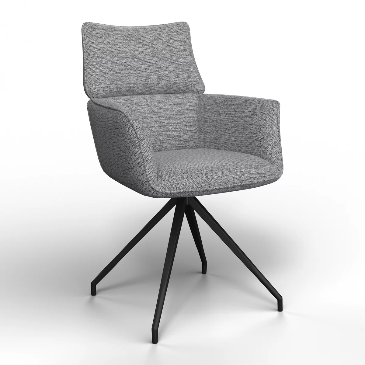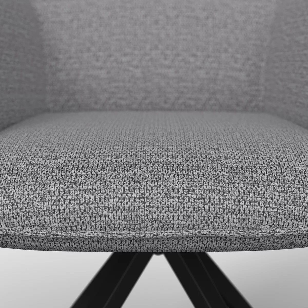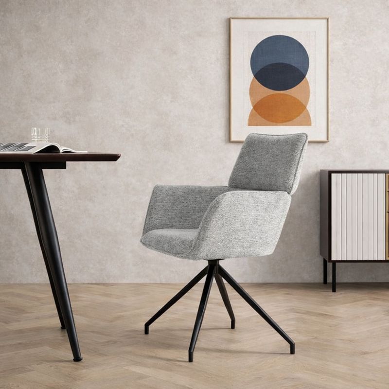 Moderní čalouněná židle v šedé barvě nabízí pohodlné sezení díky pěnové výplni a ergonomickému tvaru. Otočná sedací plocha o 180° zvyšuje komfort při používání. Stabilní kovové nohy s černým práškovým lakem zajišťují pevnost a nosnost až 140 kg. Vhodná do jídelny i moderního interiéru.
