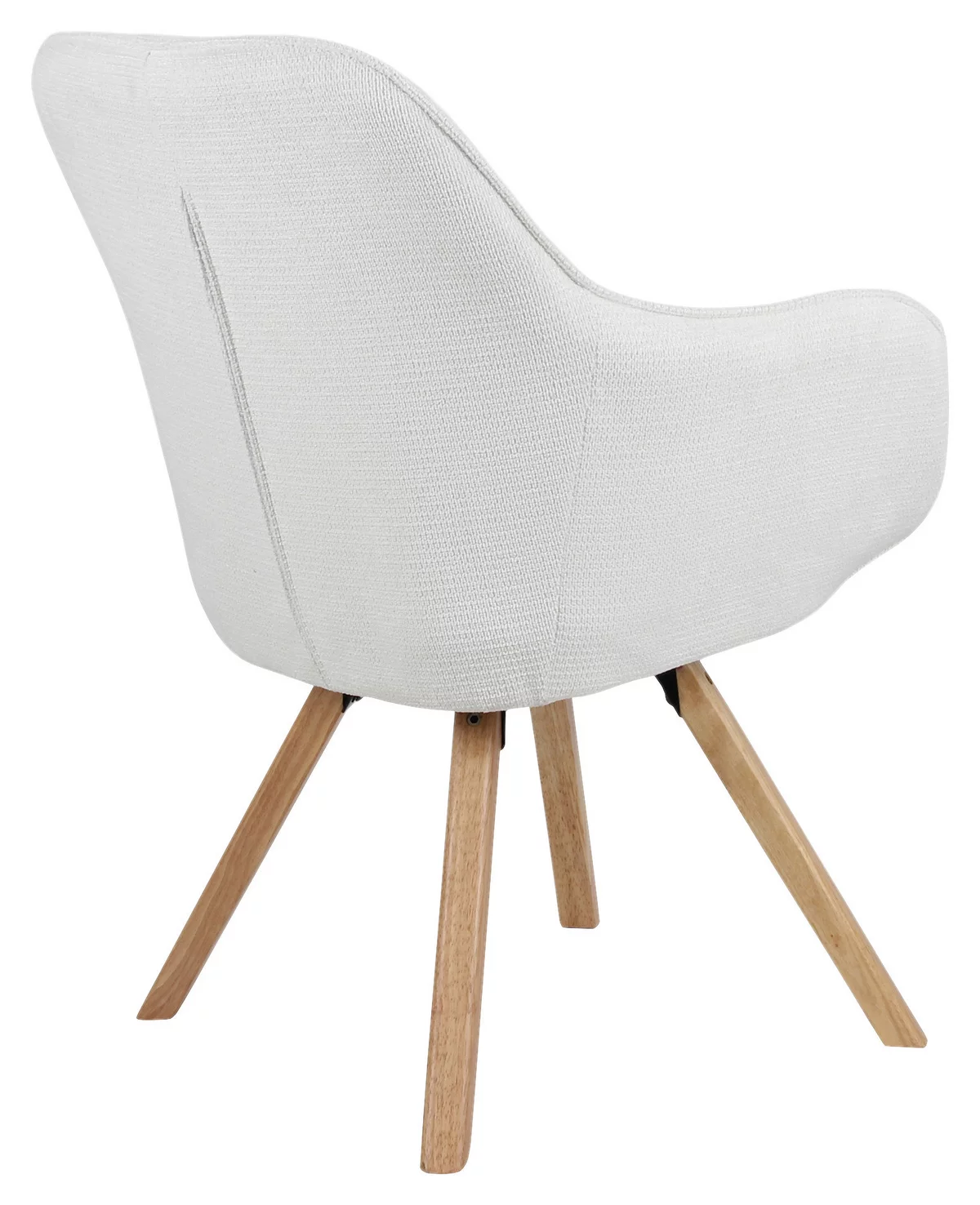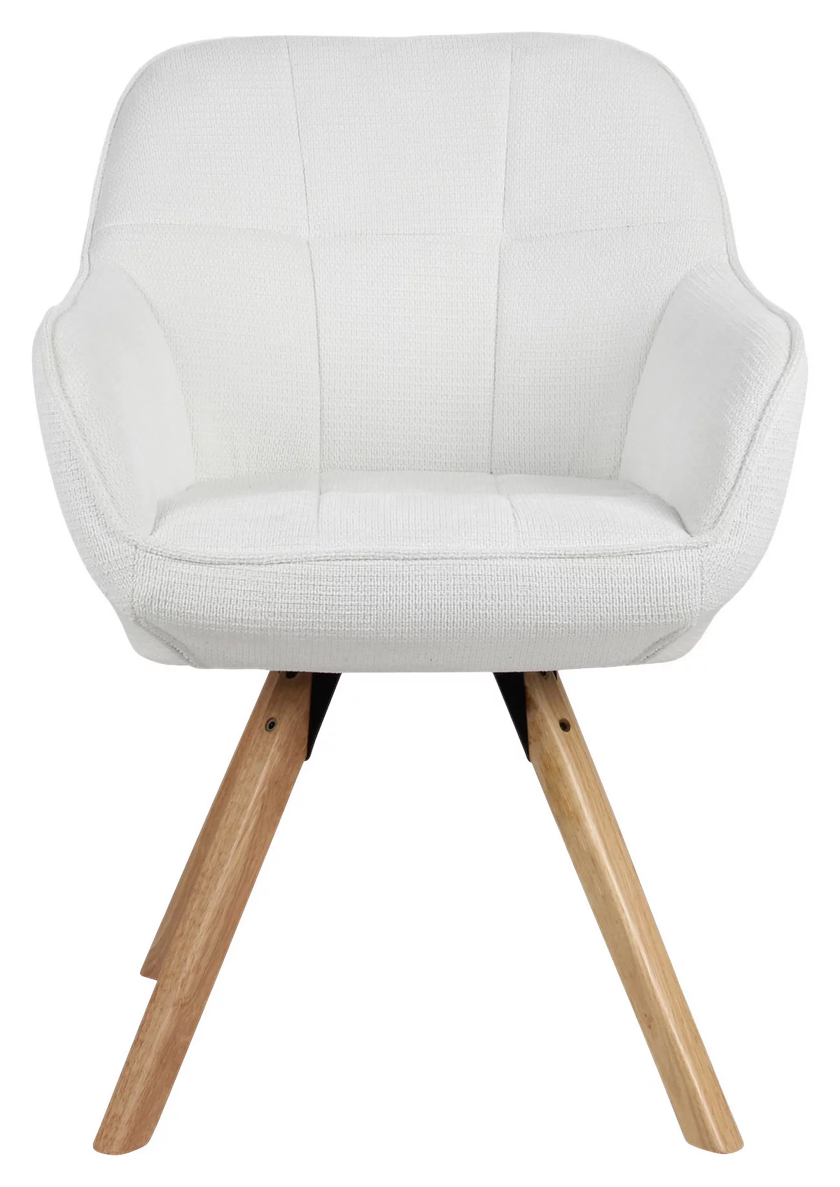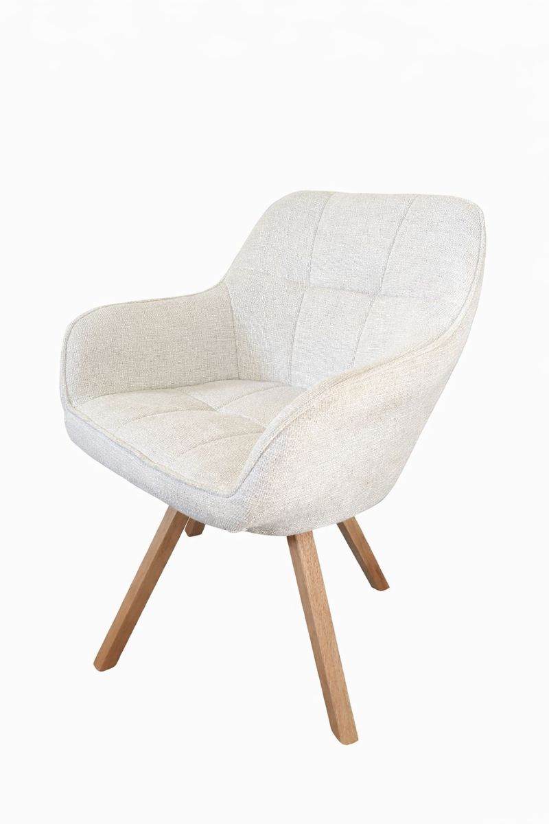 Čalouněná otočná židle s pěnovou výplní a bílým polyesterovým potahem se strukturou. Stabilní konstrukce z kovu a pravého dřeva (kaučukové dřevo), nohy v přírodním odstínu. Sedák otočný o 360°, vysoká odolnost látky (50 000 otěrů), impregnovaný textil. Nosnost 110 kg, snadná montáž. Rozměry 59 × 84 × 61 cm, výška sedáku cca 48 cm.