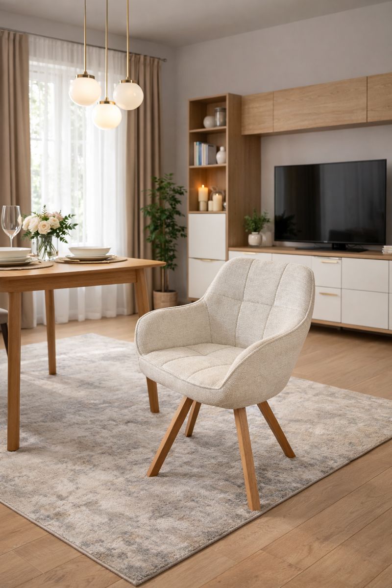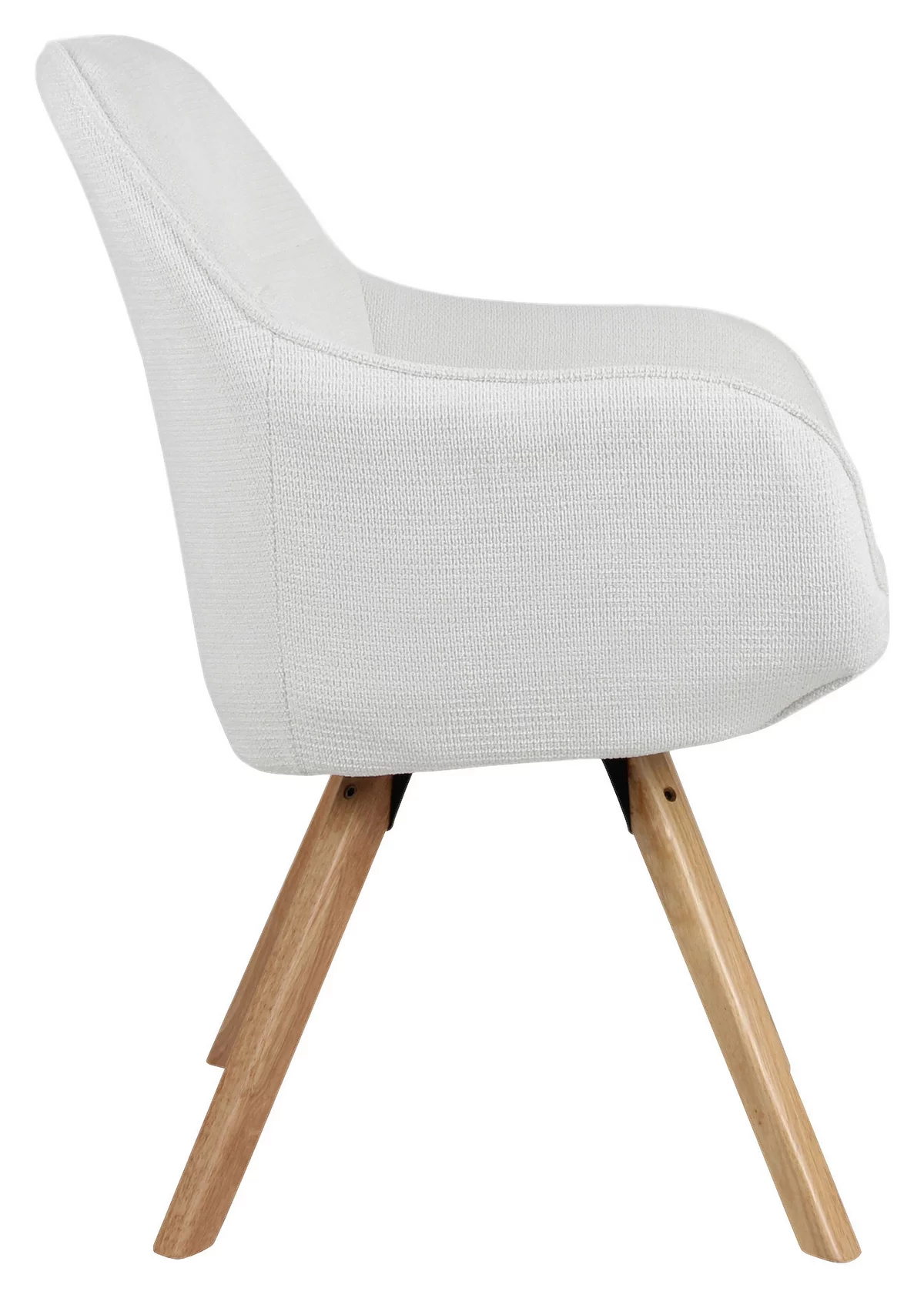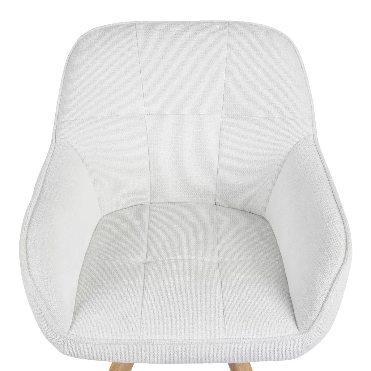 Čalouněná otočná židle s pěnovou výplní a bílým polyesterovým potahem se strukturou. Stabilní konstrukce z kovu a pravého dřeva (kaučukové dřevo), nohy v přírodním odstínu. Sedák otočný o 360°, vysoká odolnost látky (50 000 otěrů), impregnovaný textil. Nosnost 110 kg, snadná montáž. Rozměry 59 × 84 × 61 cm, výška sedáku cca 48 cm.